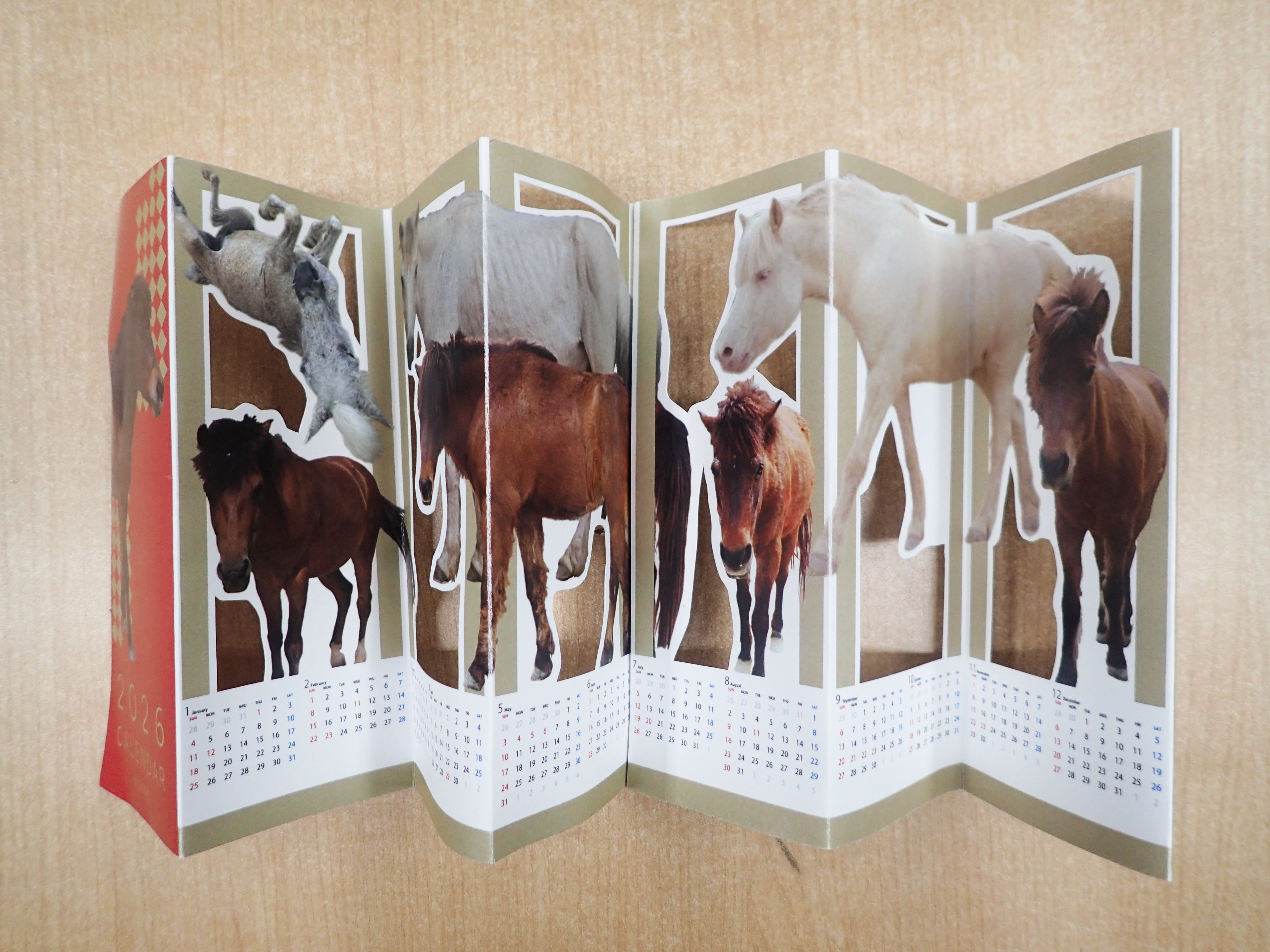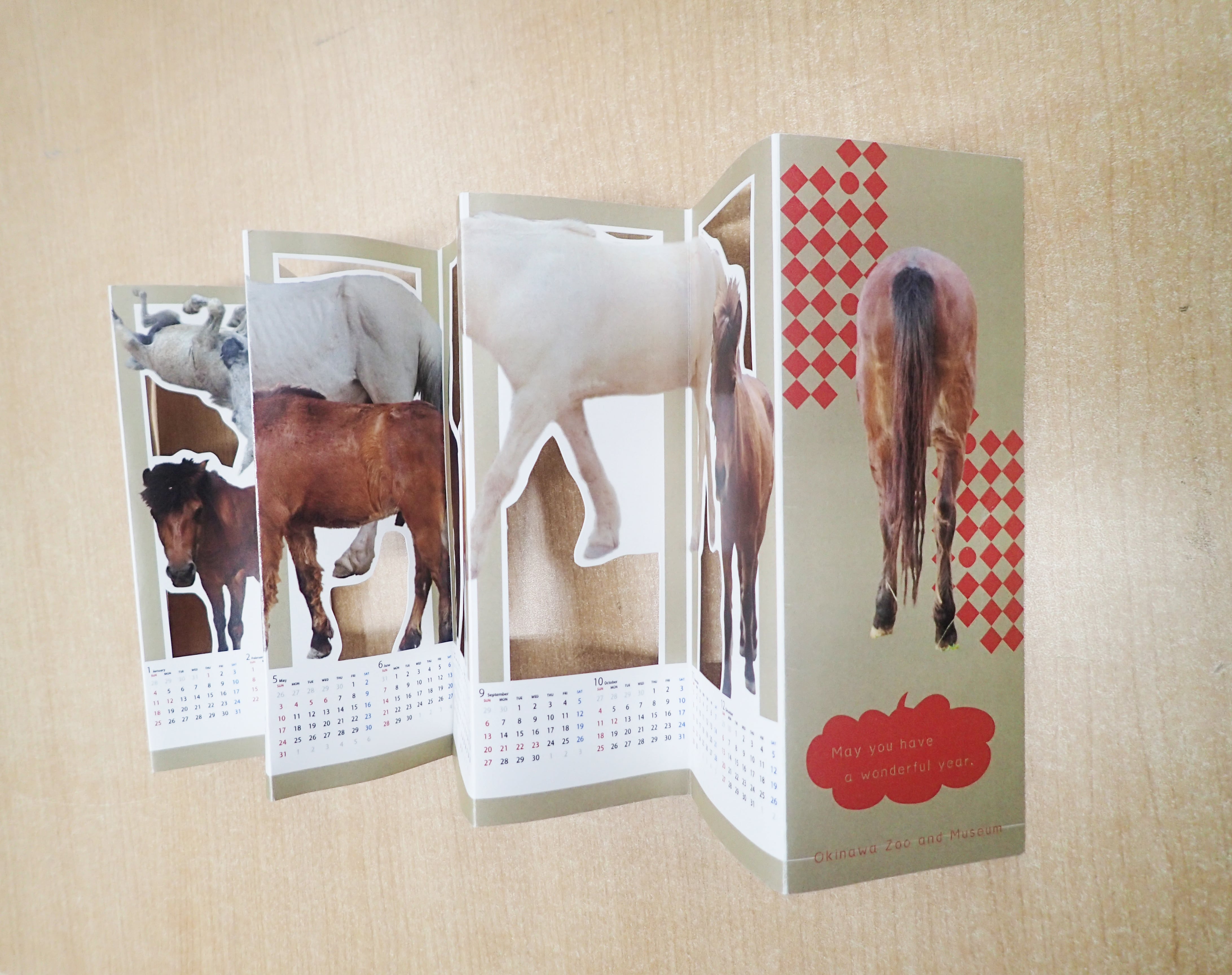 沖縄こどもの国の馬たちを屏風状にデザインしたカレンダー。